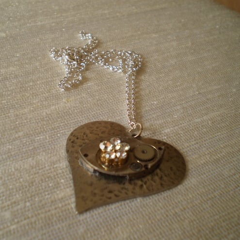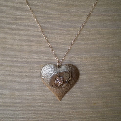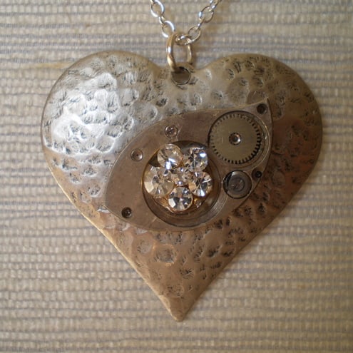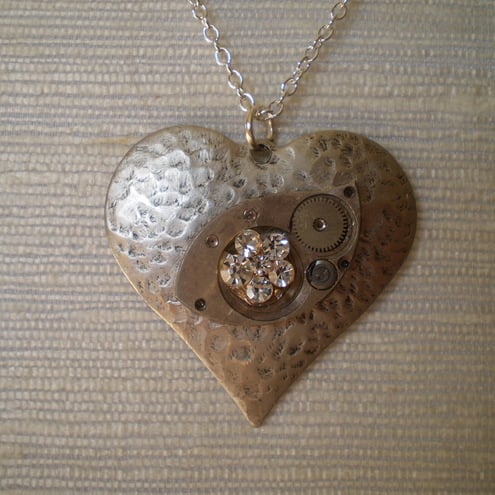 Wear your heart for all to see.... or give as a gift to someone special in your life. A textured, hammered silver tone and antiqued heart has had a beautiful vintage watch part added to compliment the curves of the heart, a small rescued Swarovski crystal earring gives a dimension of sparkle. A unique piece of jewellery, not to be found on the High Street. The heart measures 4 cms across and comes on a longer 24 inch chain. (Can be put on a shorter chain if required)