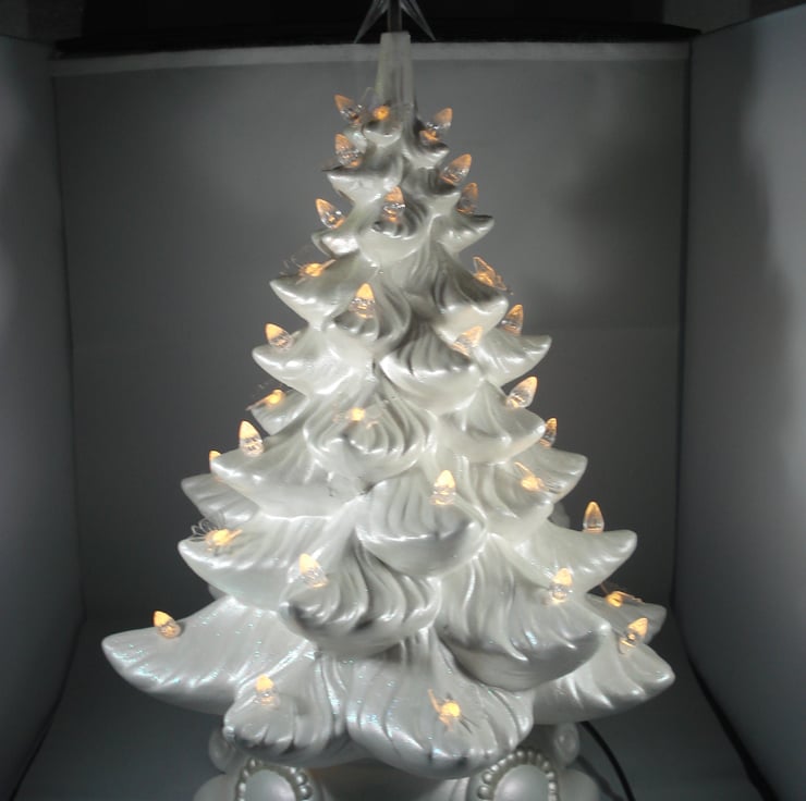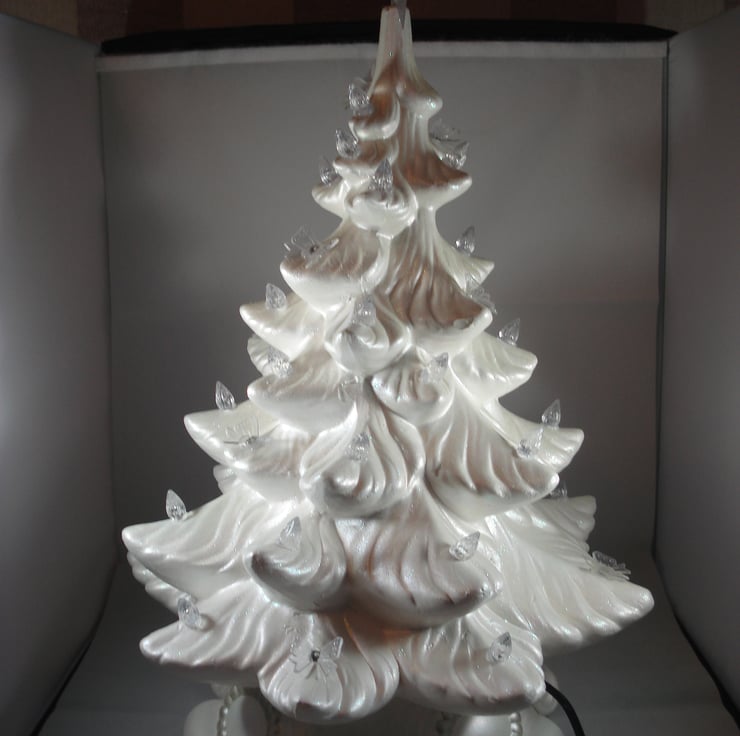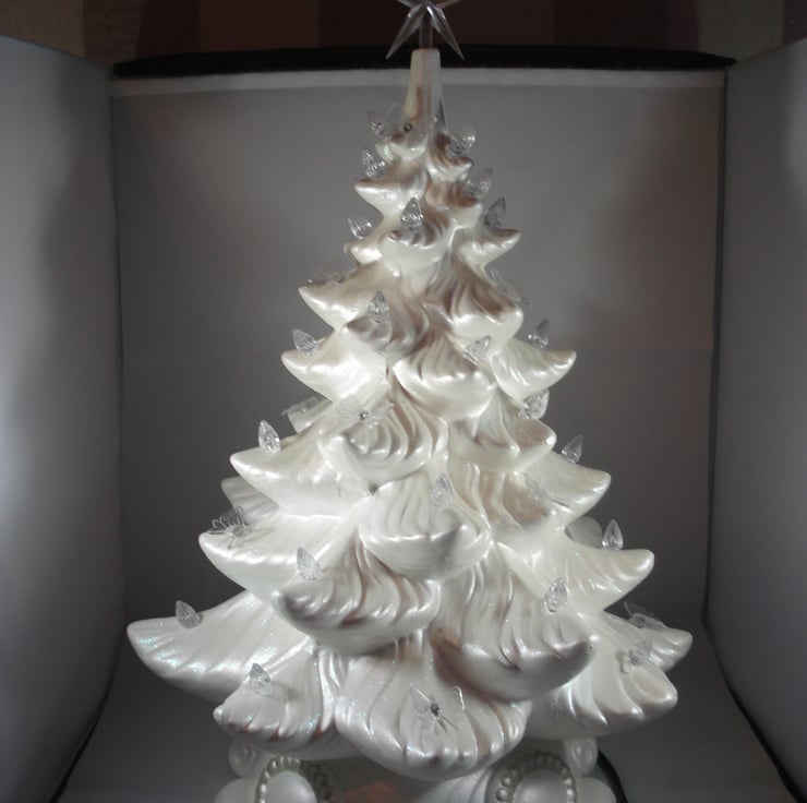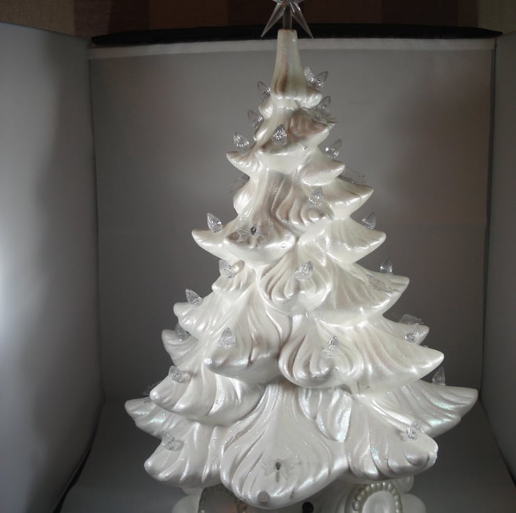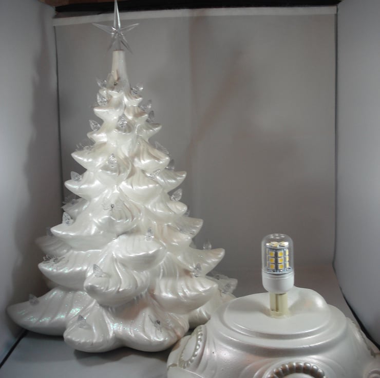 I have for sale a large ceramic Christmas tree table lamp, which was hand painted by myself. It is a white glittery tree, which contains many small plastic lights and bows, in a clear colour, with a star on the top. The base is completely separate and contains the electrics. Included in the sale is a free G9 LED bulb. PLEASE NOTE: the plug will be supplied, but it will not be fitted. Also, the star will be removed when packaging it up, this will make it easier for storage when not in use. This would make a lovely addition to anyone's Christmas decorations, or perhaps given as a gift.