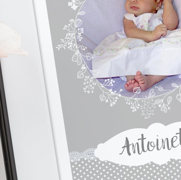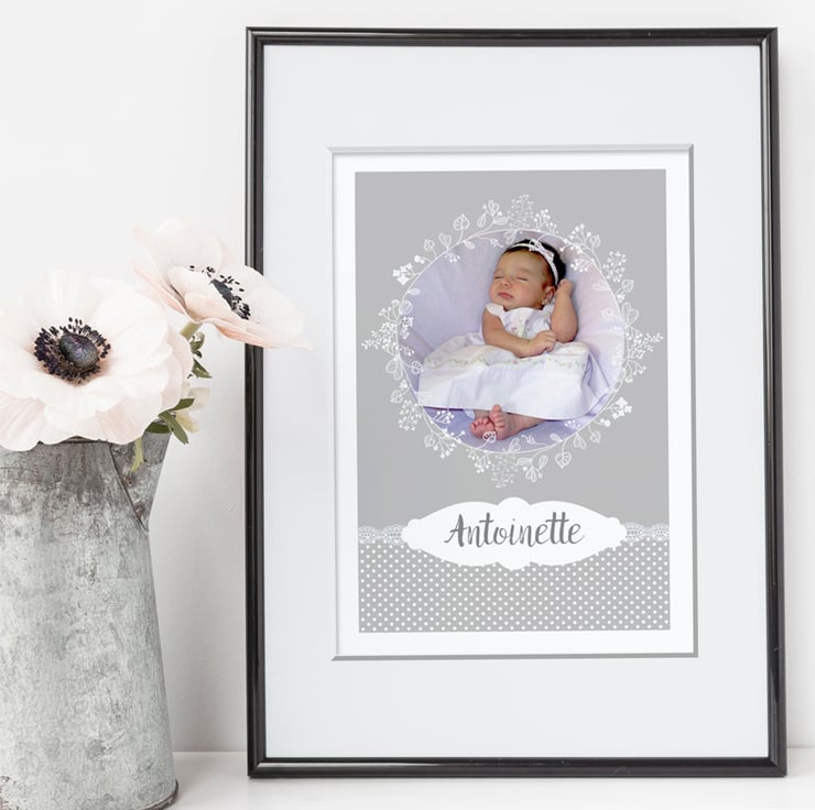 This personalised baby print will look beautiful in a newborn baby’s nursery. In soft neutral pale grey and white, this A3 poster-sized print features your favourite photo and is personalised with your chosen name too. A delightful baby name print that will make a lovely finishing touch in their bedroom.