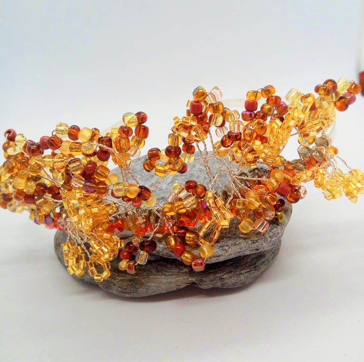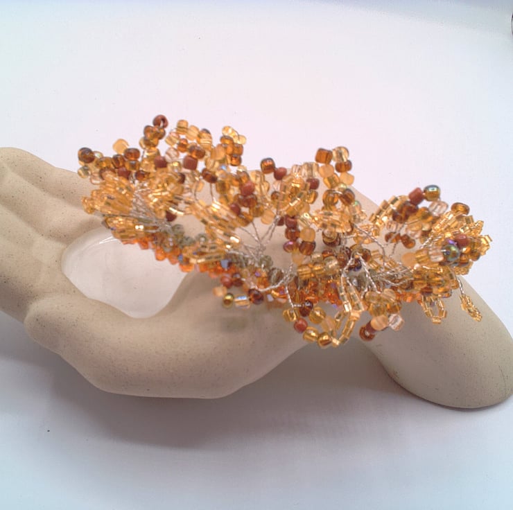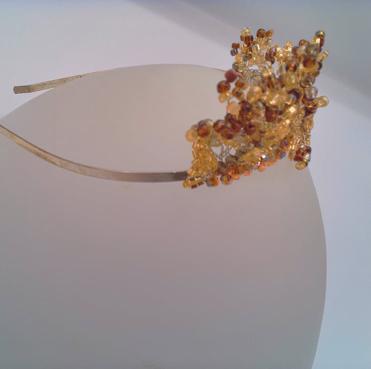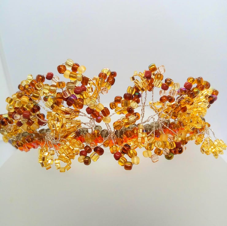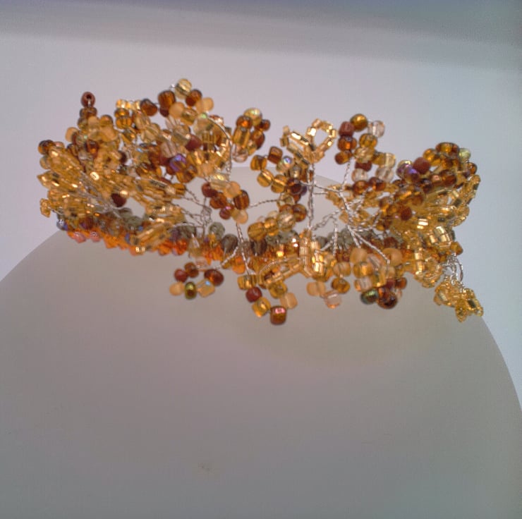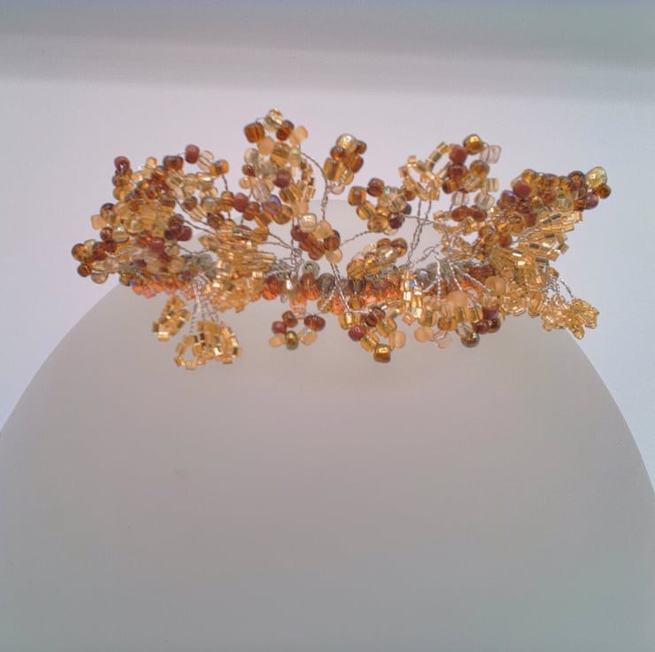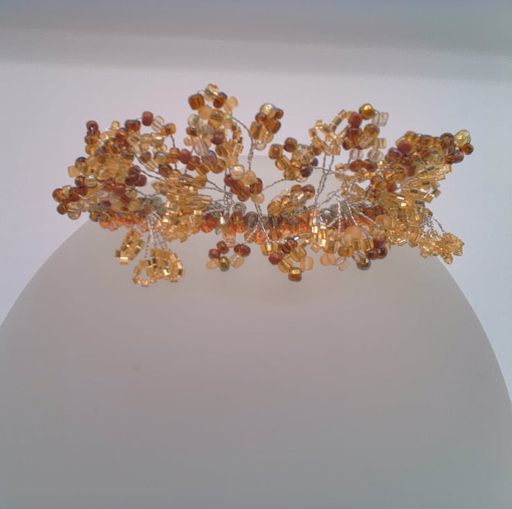 This pretty golden brown and gold beaded tiara or headdress would look great worn in your hair for any special occasion such as your wedding or a prom night. It would also make a great gift for a young lady for her prom night, or for a bridesmaid or flower girl on your special day. The tiara has little floral sprig decorations, made using small golden brown and gold coloured seed beads mounted on a silver plated flexible base. It is 3.5 cm tall in the centre. The tiara will be dispatched wrapped in tissue paper in a presentation box and delivered to you via Royal Mail first class post.
