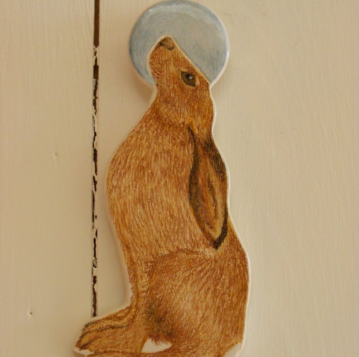 The Moongazing hare stares up in wonder at the full moon, as her coat shines from the mystical softness of the beams of the full moon, ceramic piece for the wall. Hand cut from my own design and hand painted and fired to a glazed finish with a hook attached.