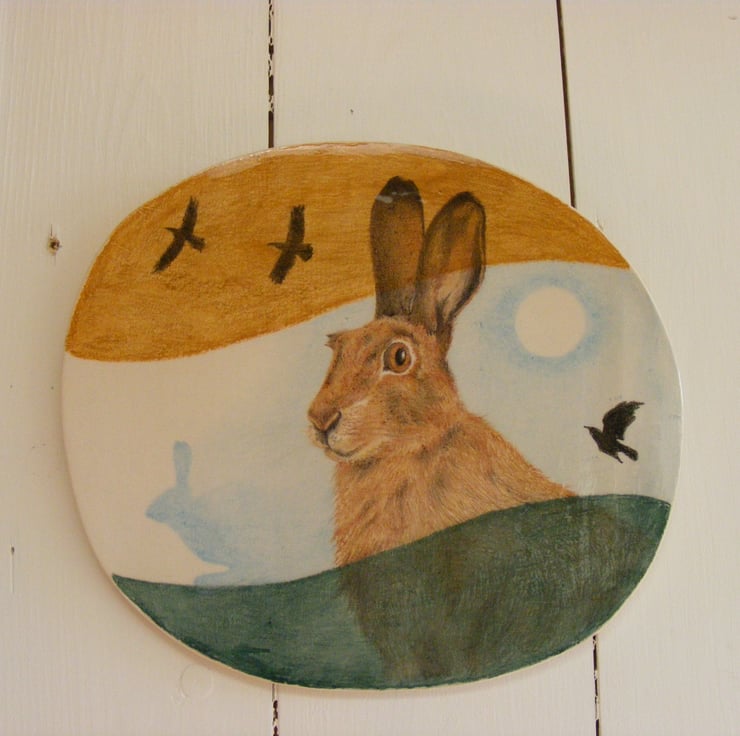 Ceramic wall hanging, Spirit of the Hare is a bespoke design handpainted, on hand cut bisque ware. Glazed to a durable finish, decor only.