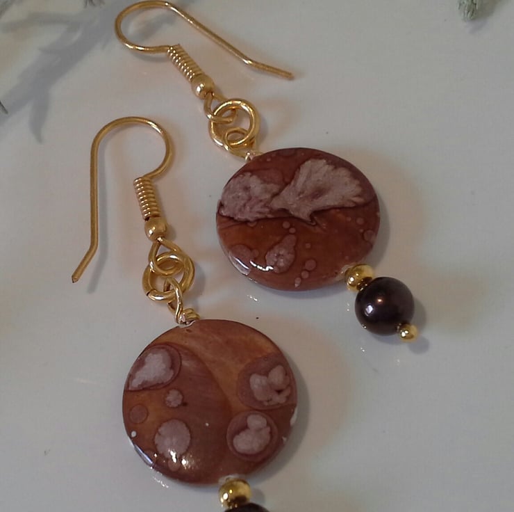 A sweet pair of very fashionable earrings designed and hand crafted using 10mm specialist printed mother if pearls flat disc gemstones complimented with quality deep brown shell pearls. All components are quality gold plated.