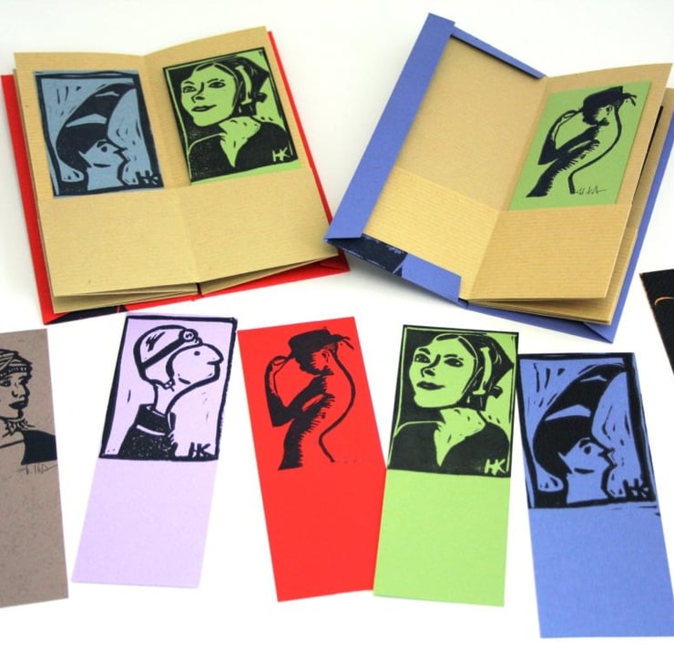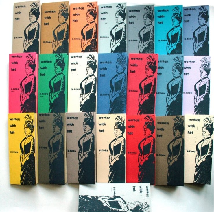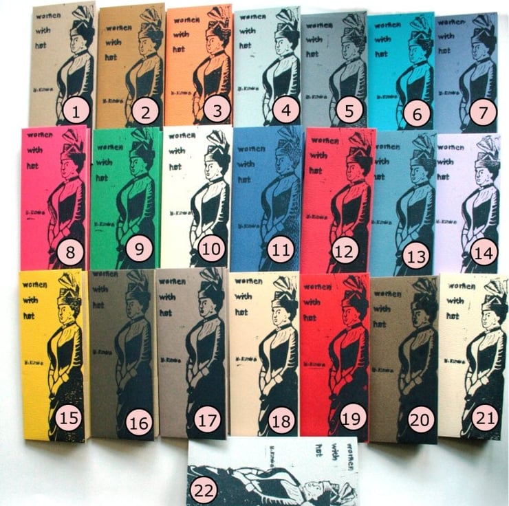 This limited edition (22 copies) features a collection bookmarks each hand printed with one of my women with hat.