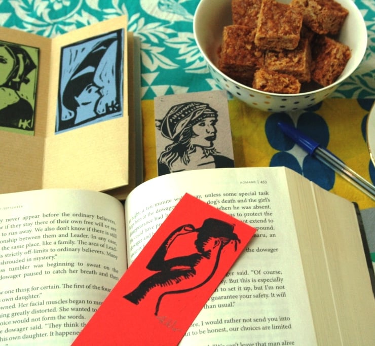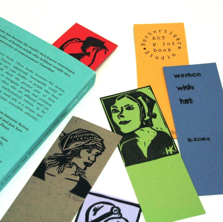 Each bookmark is an original, handcut and hand-rubbed relief print. Three of them have my initials engraved ("HK") the others are signed.