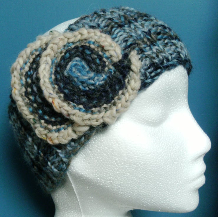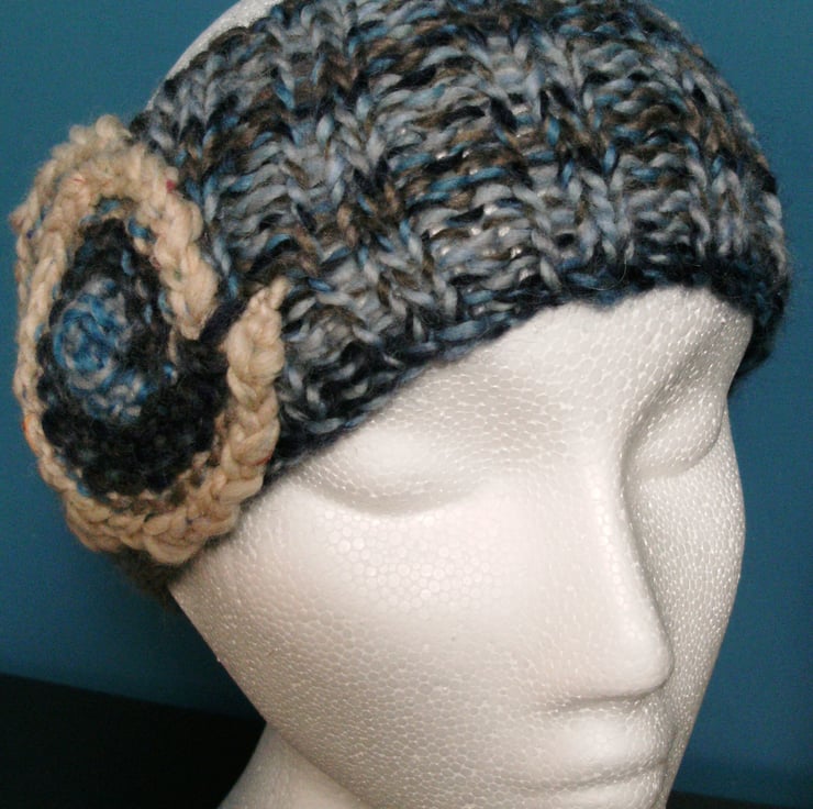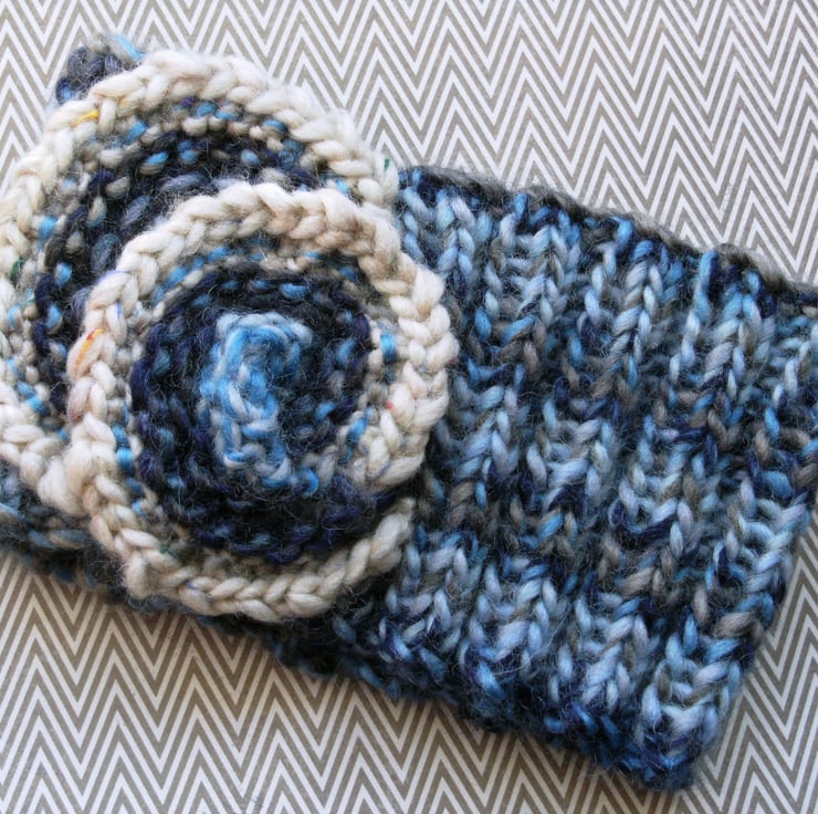 Hand knitted for this season. 100% Wool. Beautifully soft and warm with a knitted swirl This band has been knitted on the round with a stretchy rib stitch. There are no seams so the self stripe of the wool is shown off to its best.