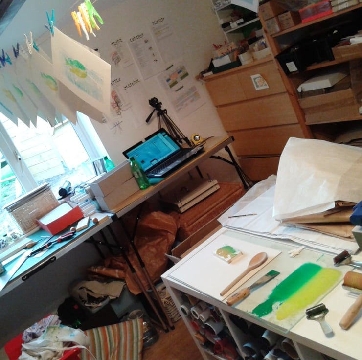 The technique used here is that of a reduction cut. For this the block is printed in several stages and after each stage more of the block is cut away. This technique is also called a suicide print, as the block is destroyed in the process, making little room for mistakes.