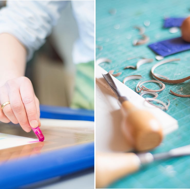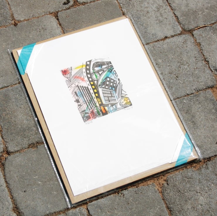 The second step involves printing the black foreground from a hand carved lino block.