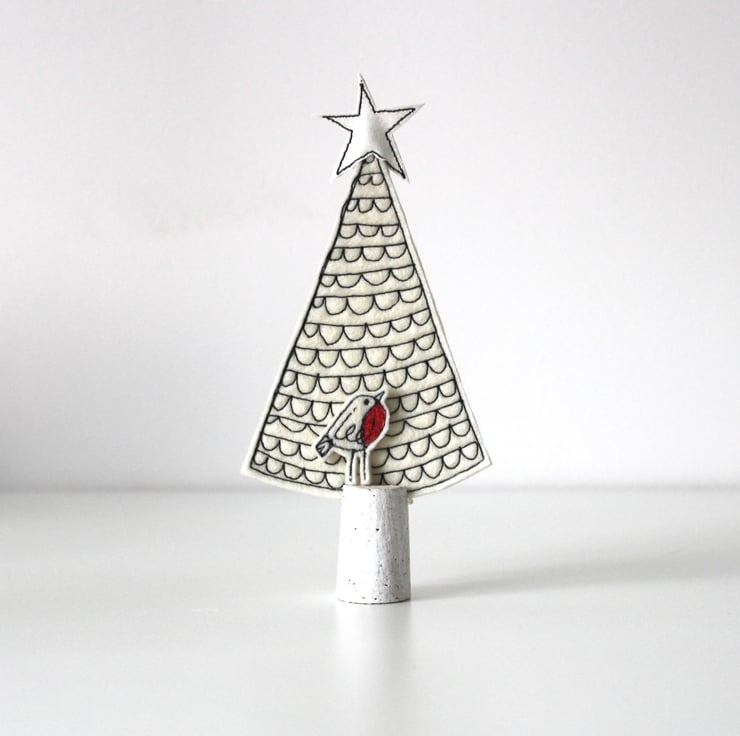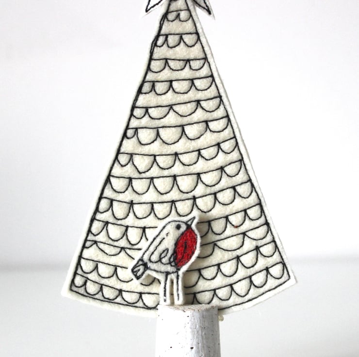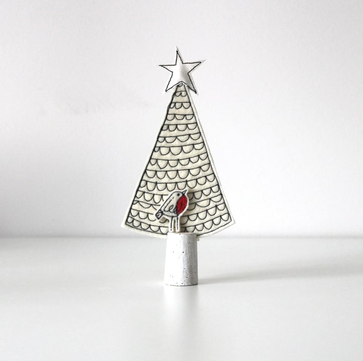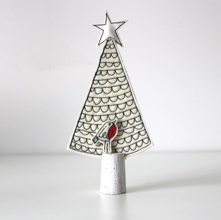 A little tree, with a glitter star and a robin.