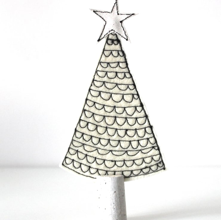 Little trees are created using free hand machine embroidery, 100% wool felt, glitter cloth and painted cork trunks.