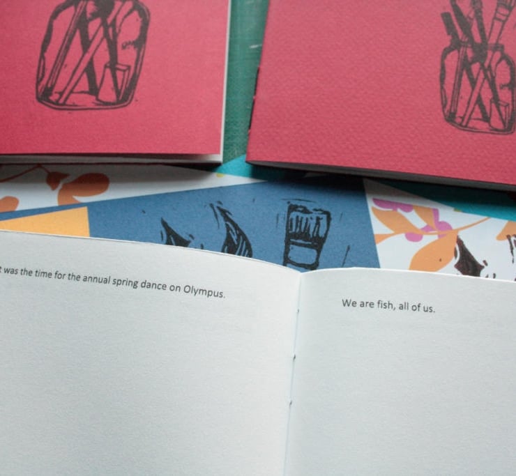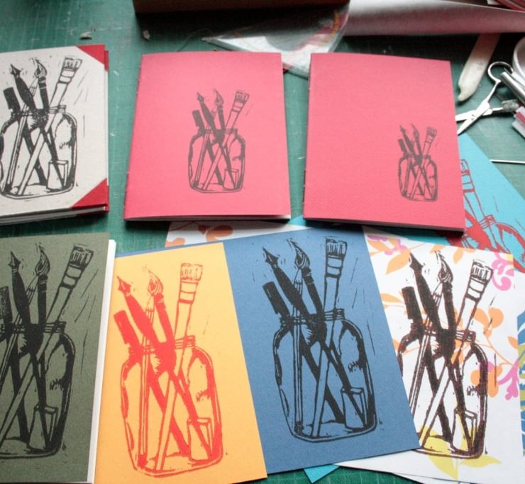 The cheapest option has colourful paper covers, adorned with a digitally enhanced and printed picture from an original linocut that I made specifically for this cover.