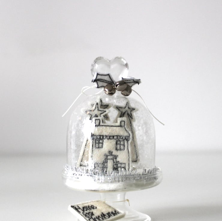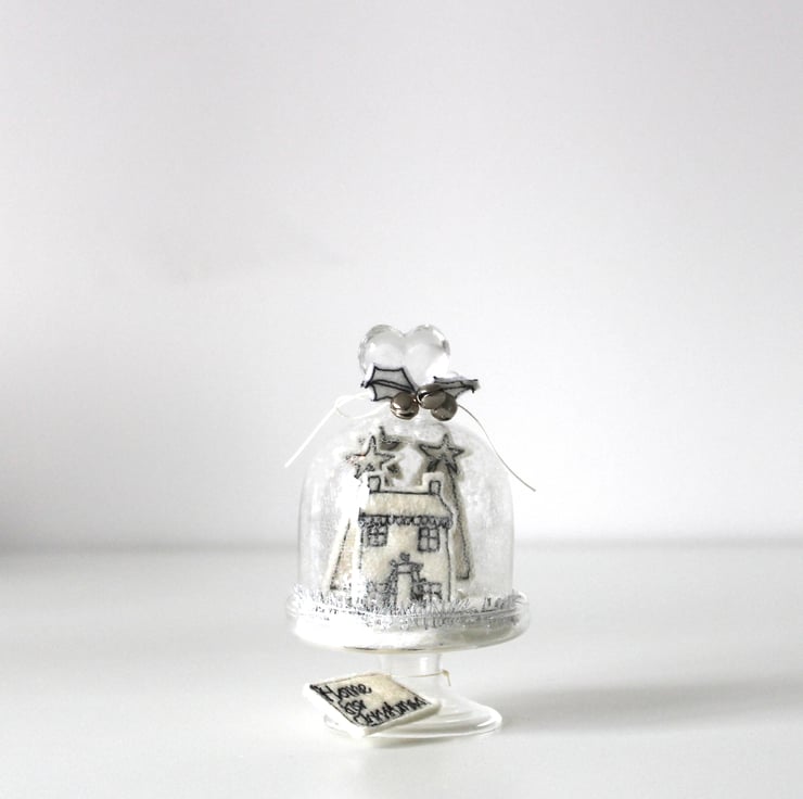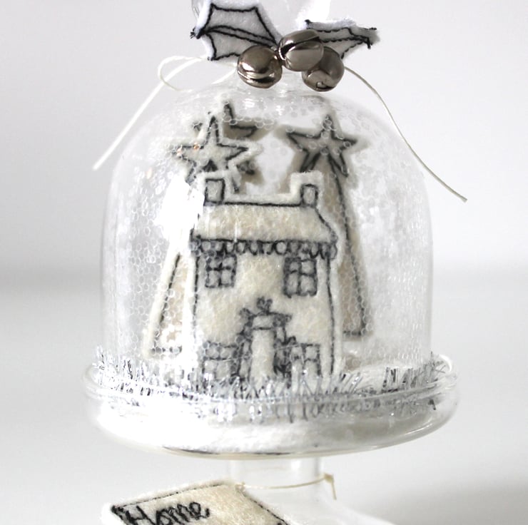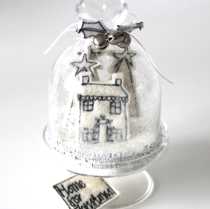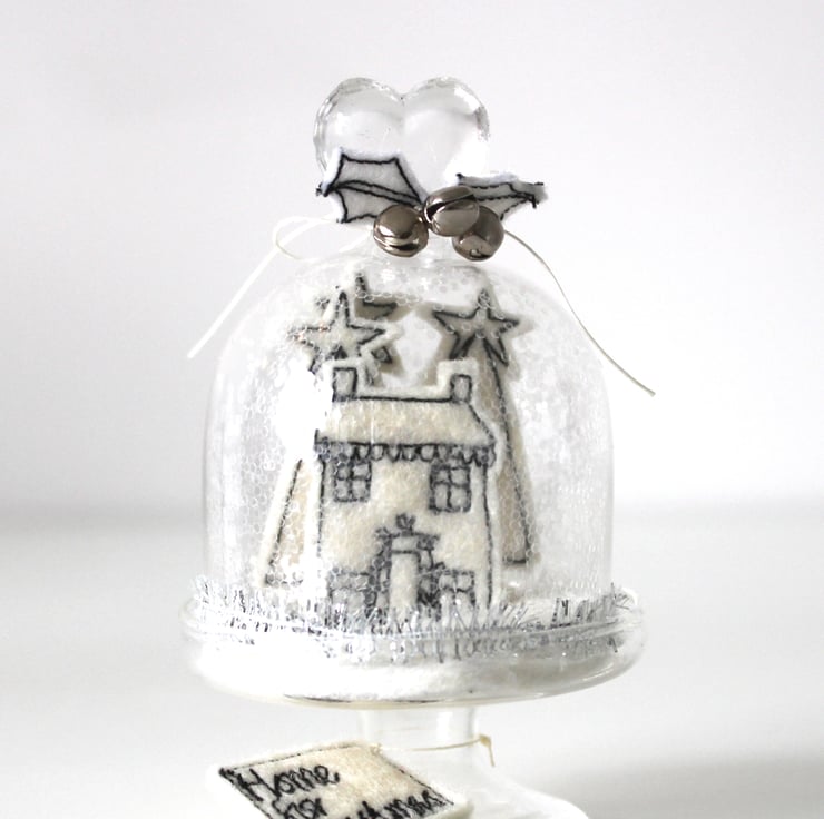 'Home for Christmas' is created using free hand machine embroidery and 100% wool felt. The festive scene is encapsulated within a glass dome, with glitter snow (not real, sorry), three bells, two holly leaves and a sign 'Home for Christmas'. Delicate tinsel finishes of this delightful Christmas decoration.
