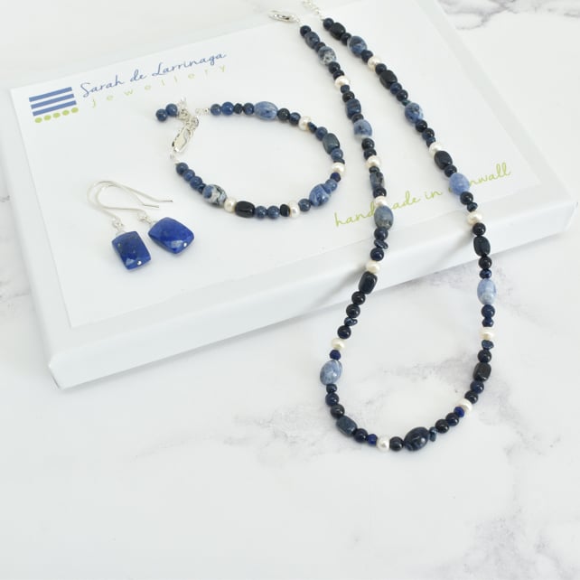 The gemstones featured are Lapis Lazuli, Dumortierite, Sodalite and white Freshwater Pearls, interspersed with Sterling Silver rondelles in a random but balanced pattern.