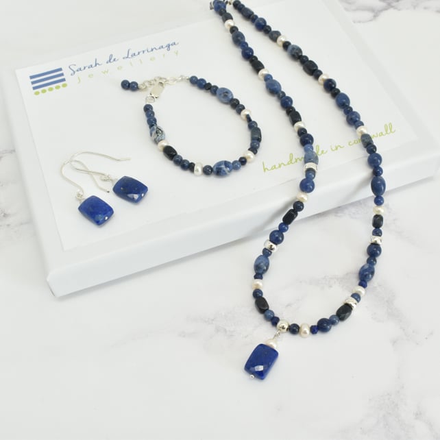 A stunning blue Lapis Lazuli stone as the central pendant makes this a memorable necklace and one of my favourites. It's an AAA stone from Jaipur in India. The gemstones making the rest of the necklace are blue Dumortierite, Lapis Lazuli, Sodalite and white Freshwater Pearls, interspersed with Sterling Silver rondelles in a random but balanced pattern.