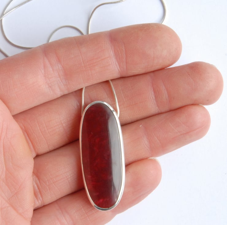 This minimalist, modern pendant features an elongated oval of deep cherry red bowlerite which has been bezel set in sterling silver with a hidden bail so it slides along the snake chain. The bowlerite has a subtle golden internal sparkle to lift the dark red colour and make the piece come to life when the sun catches it. The elongated oval measures 40 by 14mm.