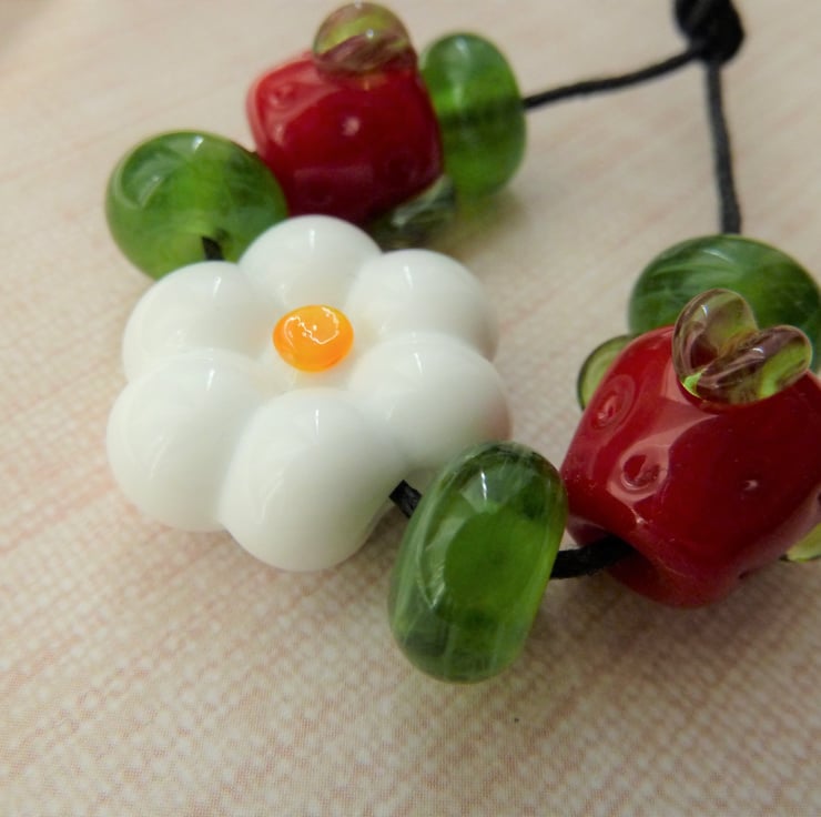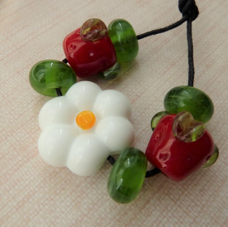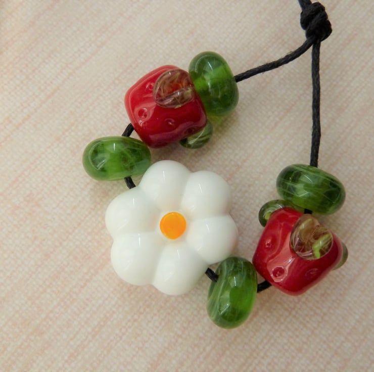 A set of 7 lampwork glass beads which feature a daisy, 2 strawberries and 4 spacer beads.