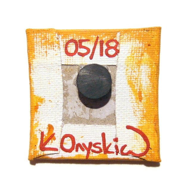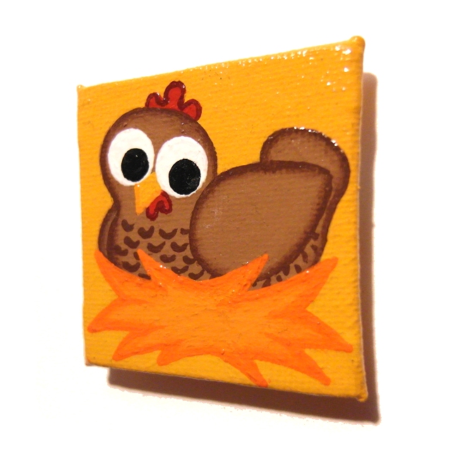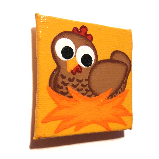 This original cartoon chicken art is painted in acrylics on a 5cm x 5cm (2" x 2") canvas board, and has been coated with a layer of clear varnish to make it more durable. A 12mm magnet is attached to the back so this little painting can stick on a fridge or other magnetic surface.