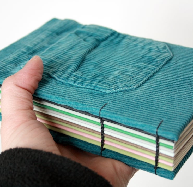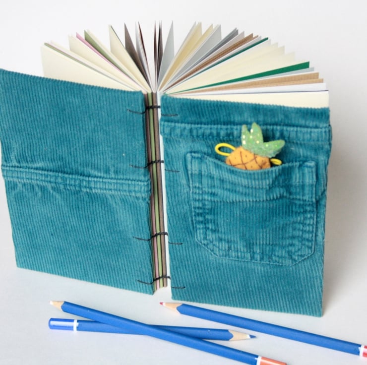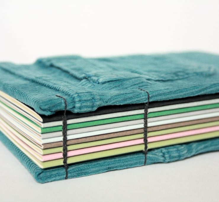 The trousers used for the covers were worn by my son when he was about 3 years old. The fabric was torn at the knees and he had grown out of them. Saving them from landfill, I made them into journal covers.