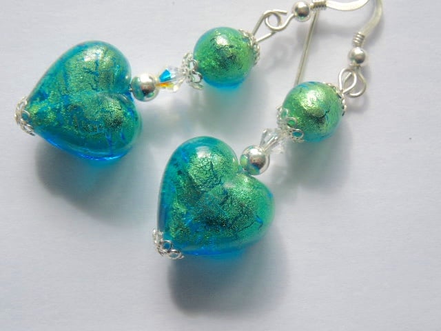 Murano glass pendant and earrings set with gold foiled green Murano glass heart (20mm) with gold foiled green Murano glass round bead. The pendant has a sterling silver sea horse charm and hangs from a sterling silver chain (18inches)The matching earrings have gold foiled Murano glass hearts and round beads with glittering Swarovski crystals and hang from sterling silver ear hooks. They measure 30mm excluding hooks and the set is presented in a pretty organza bag. All Murano glass used is genuine and sourced on the island of Murano, Venice.