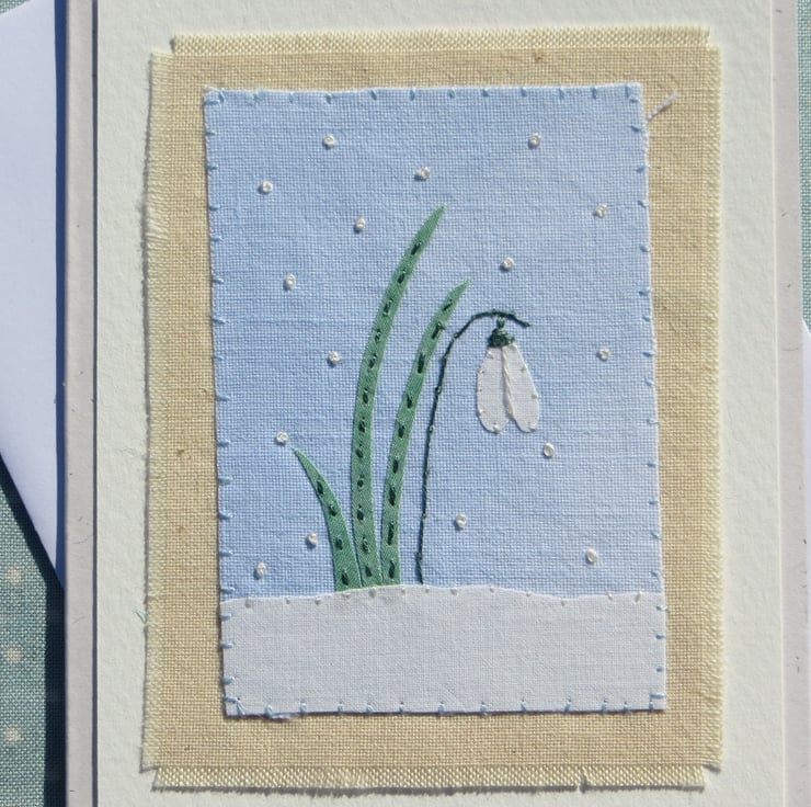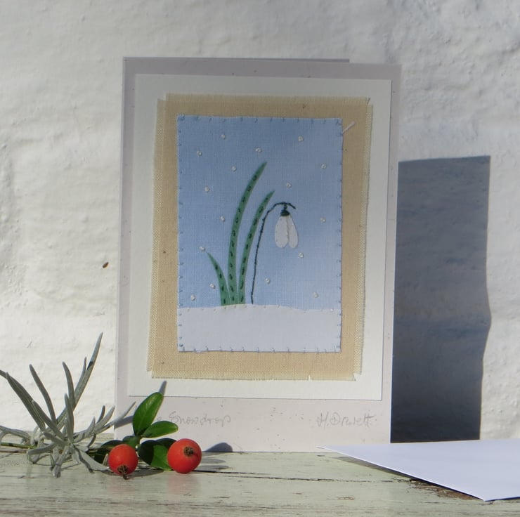 A miniature hand-stitched applique snowdrop in snow made from hand-dyed recycled cotton with intricate top-stitched details. Perfect for Christmas, New Year or January or February birthday, definitely a card to keep! Also suitable for sympathy, bereavement or get well....