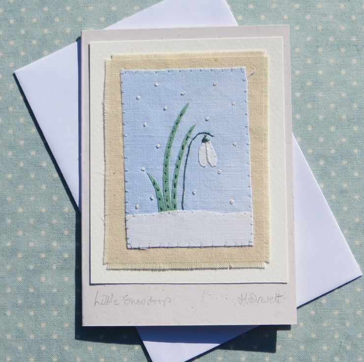 All my cards measure 12 x 9 cm and come with toning recycled paper envelopes in clear protective cellophane sleeves. Each card is signed on the front and my studio stamp is on the back. Cards are made from stout 100% recycled card - blank inside. The title is written below the textile: 'Little Snowdrop'.