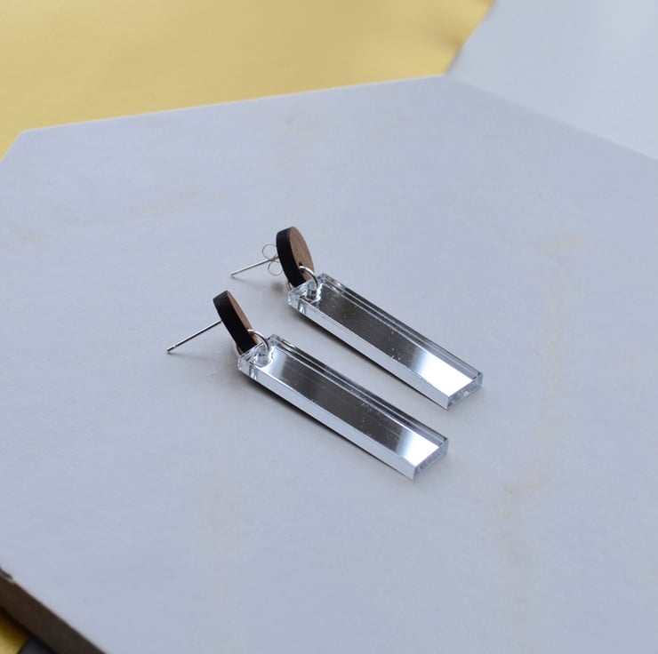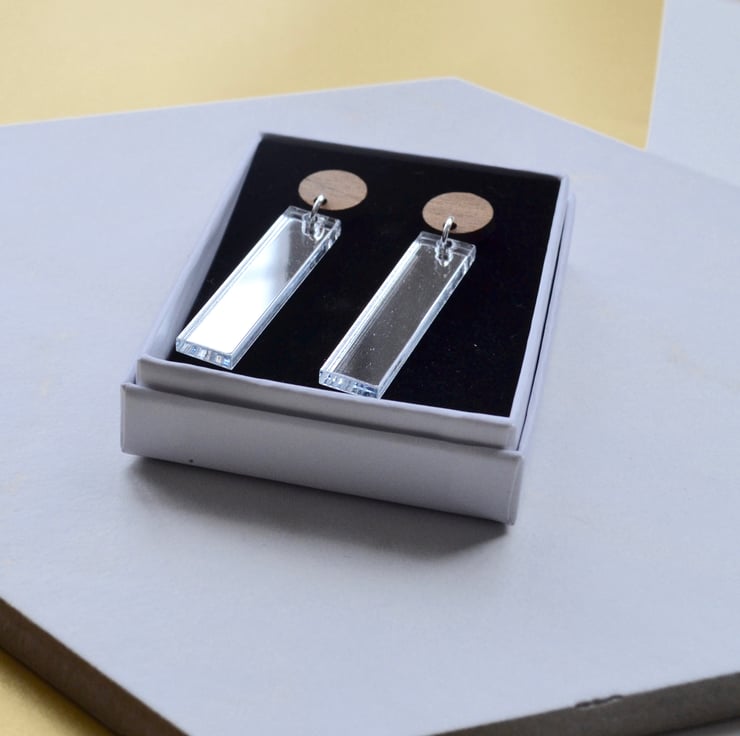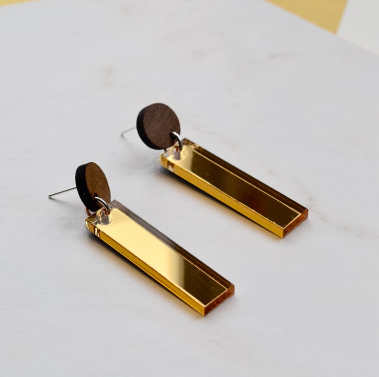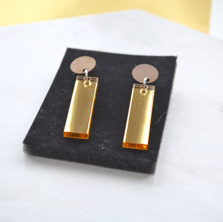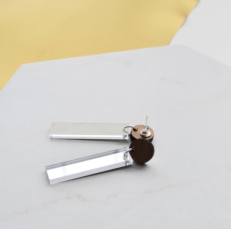 These statement drop earrings are made from laser cut walnut wood and mirror acrylic. The top part is a walnut wood circle, which has a post and butterfly back. The rectangle shape hangs from this and comes in dazzling mirror gold or mirror silver acrylic.