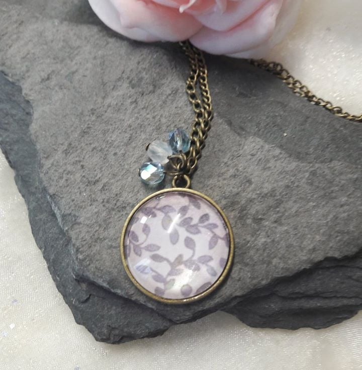 Funky purple necklace in classical style with decorative Czech ab crystals. It is on a Bronze Chain. The floral print has been secured in place on the Bronze cabochon base, using mod podge and clear glass dome.