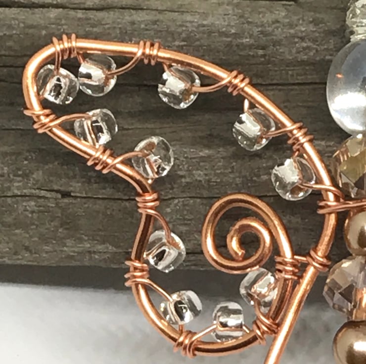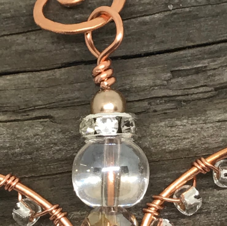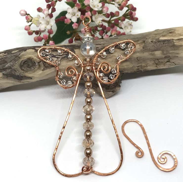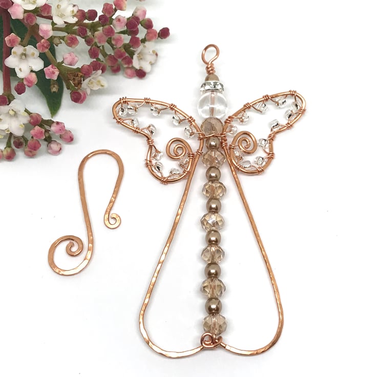 Copper wire is formed into an angel shape using wire wrapping techniques. I have threaded glass pearls, Czech rondelle crystals and a sparkling rhinestone spacer bead on to copper wire and attached this to the center of the angel shape with a loop at the top and swirl at the bottom. Seed beads are wrapped around the Angel’s wings. The decoration is completed with a handcrafted hook for hanging the decoration. The copper has been hammered to give a textured finish.