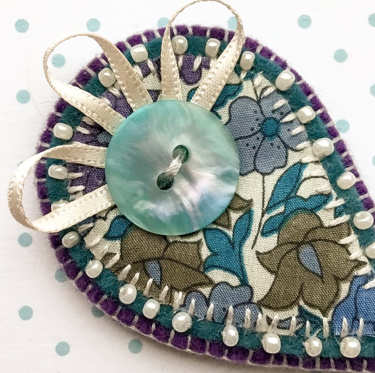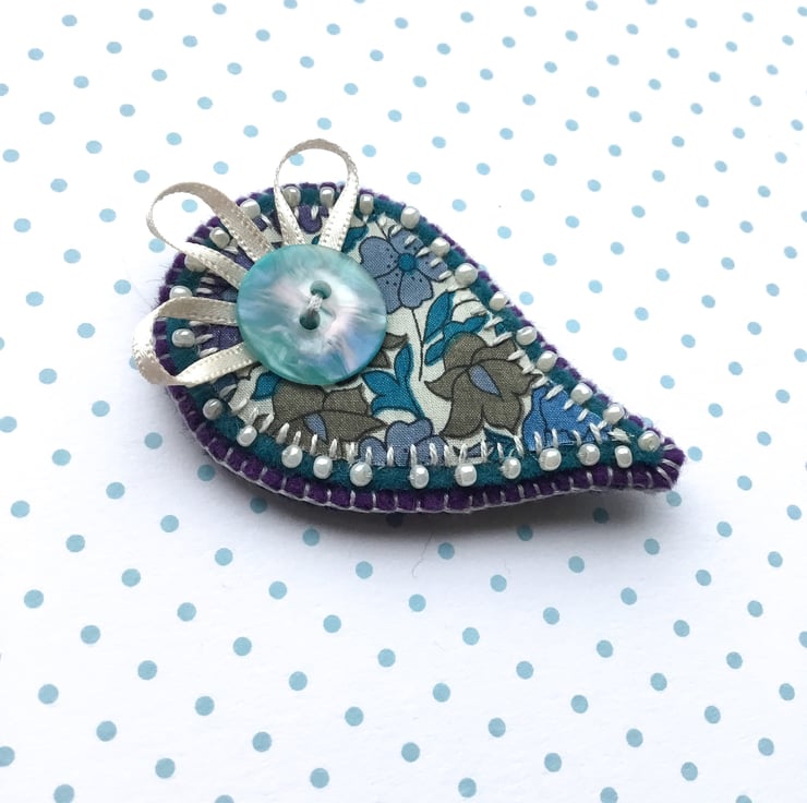 The brooch is entirely hand stitiched and features an applique paisley design in lovely Liberty of London fabric. It has been sewn onto teal felt which has been edged with cream seed beads, it has been further mounted onto purple felt and is finished with a feature button and ribbon detail. There is a metal brooch pin on the reverse side for easy attachment.