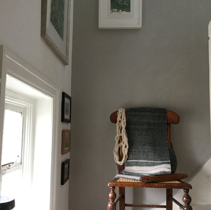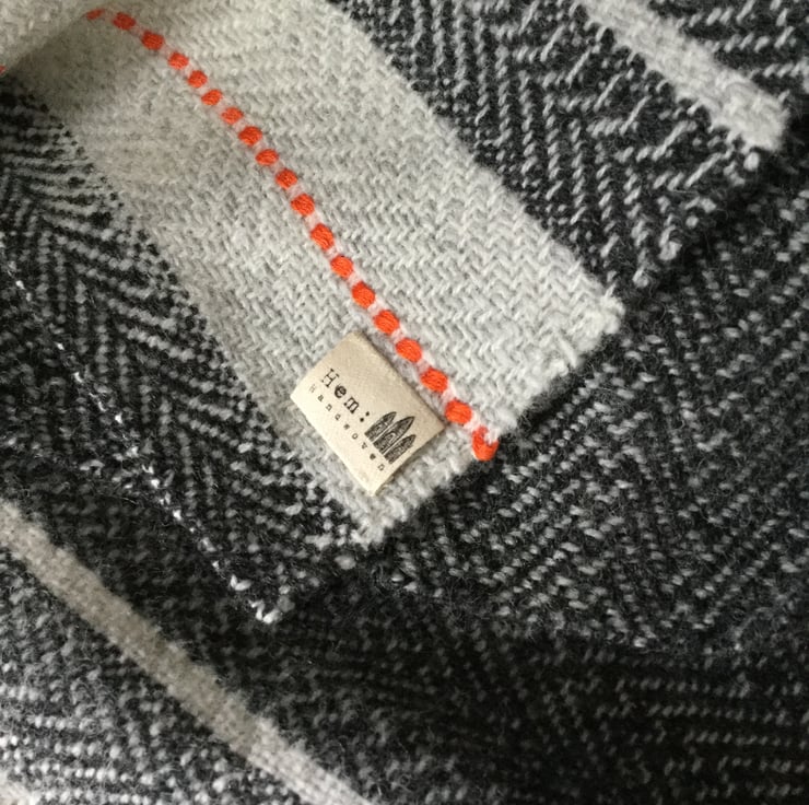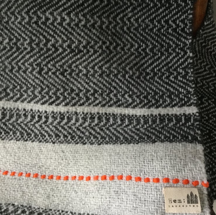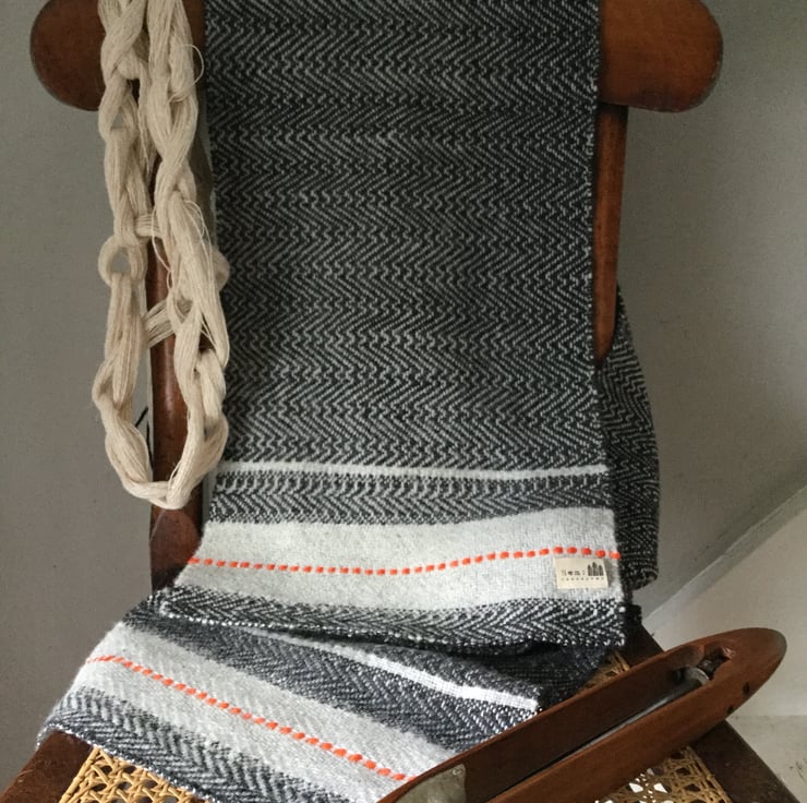 A hand woven scarf in soft and warm charcoal grey, silver and undyed natural lambswool, in a point twill, with an orange accent stripe. Woven by hand on an antique loom. Inspired by watching the RNLI lifeboat crew at Staithes. 10% of the sale price will be donated to the Staithes lifeboat.