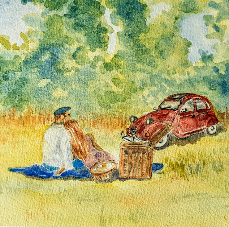 This is my original small watercolour painting of a young couple enjoying a romantic picnic in an imagined sunny rural scene, accompanied by their trusty classic Citroen 2CV "tin snail" car.