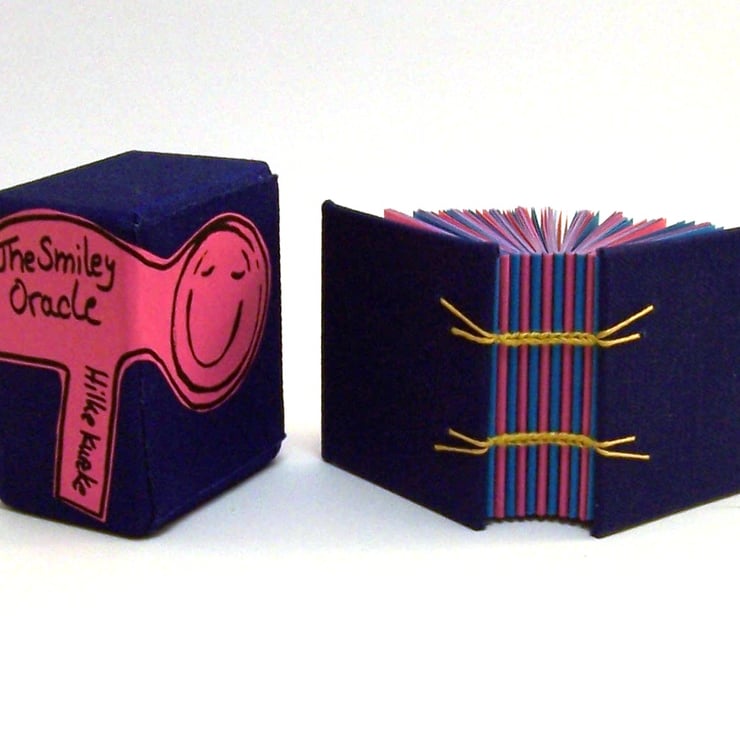 160 of the 320 pages carry a smiley face (always the right hand side). These are hand printed from 18 different hand cut lino blocks. The book is bound in so called Coptic style, with the thread visible on the spine.