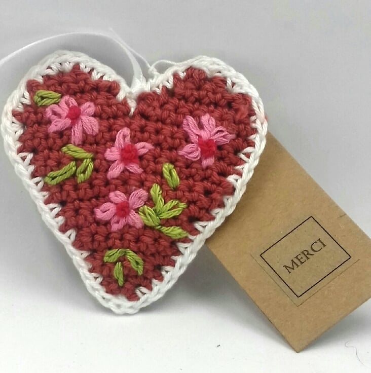 The heart is crocheted and embroidered in cotton and lined with two layers of felt for stability. It measures approximately 8 cm in length and the tag reads 'Happy Christmas Sweetheart! although I am very happy to exchange this tag for one with a message of your choice.