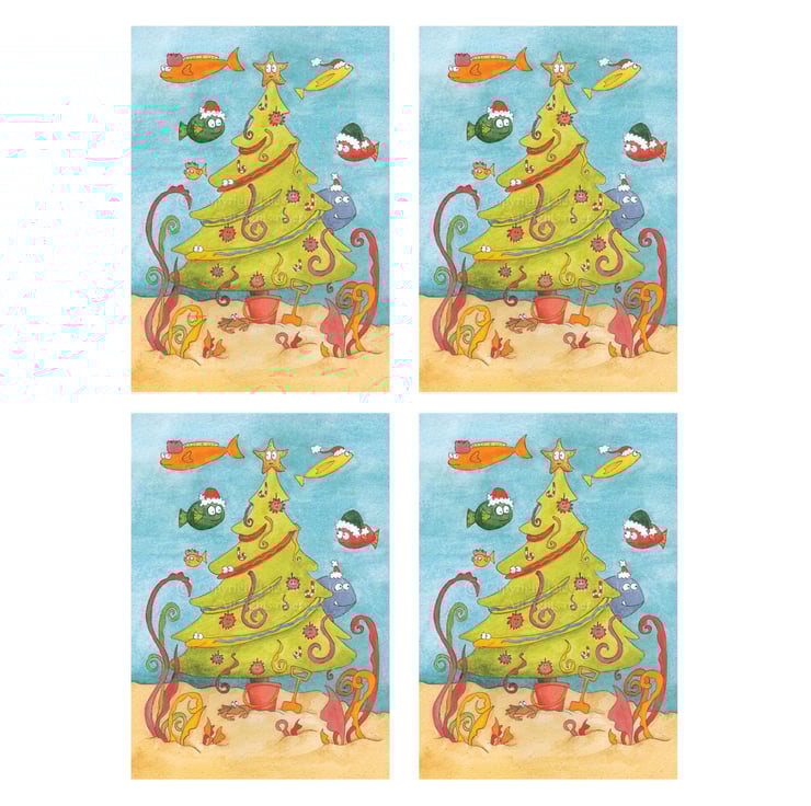 Pack of 4 greeting cards featuring my 'Underwater Christmas' illustration. I painted the original image with watercolours. Each card is A5 size and comes with a white envelope. Blank inside for your own message.