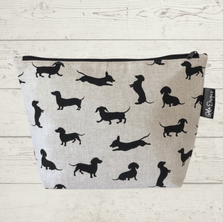 This cute dachshunds large makeup bag is lined with a black waterproof nylon, great for those inevitable spills.