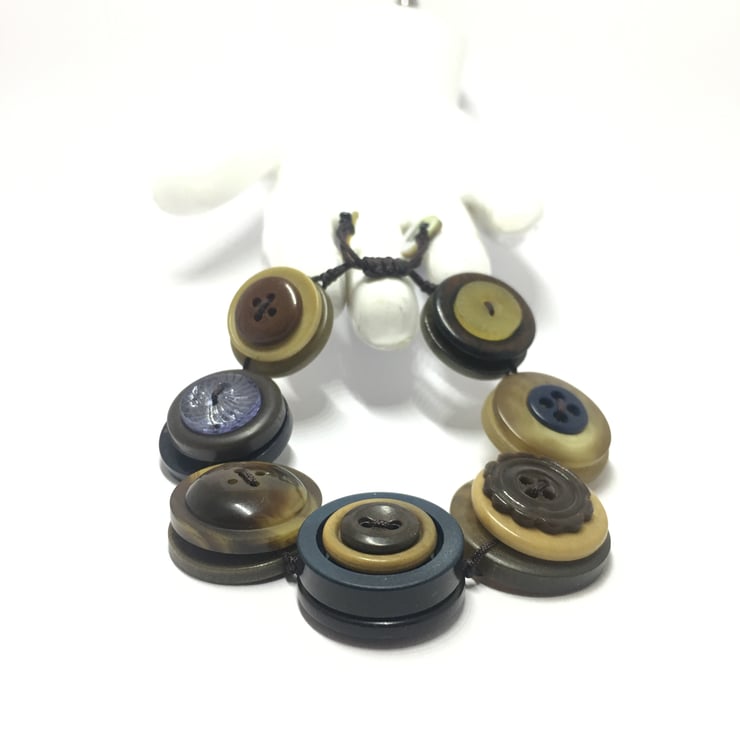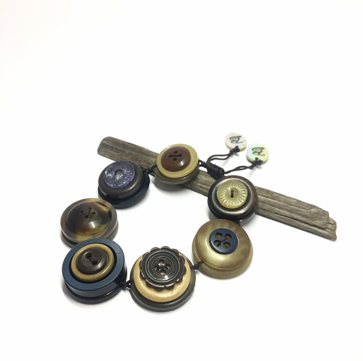 A gorgeous lot of vintage buttons formed this stunning piece of bracelet. Also this bracelet was designed from my vintage buttons collection so you will be the one to own this charming piece of jewellery. Two of my signature B laser onto tiny shell pendant to finish the look.