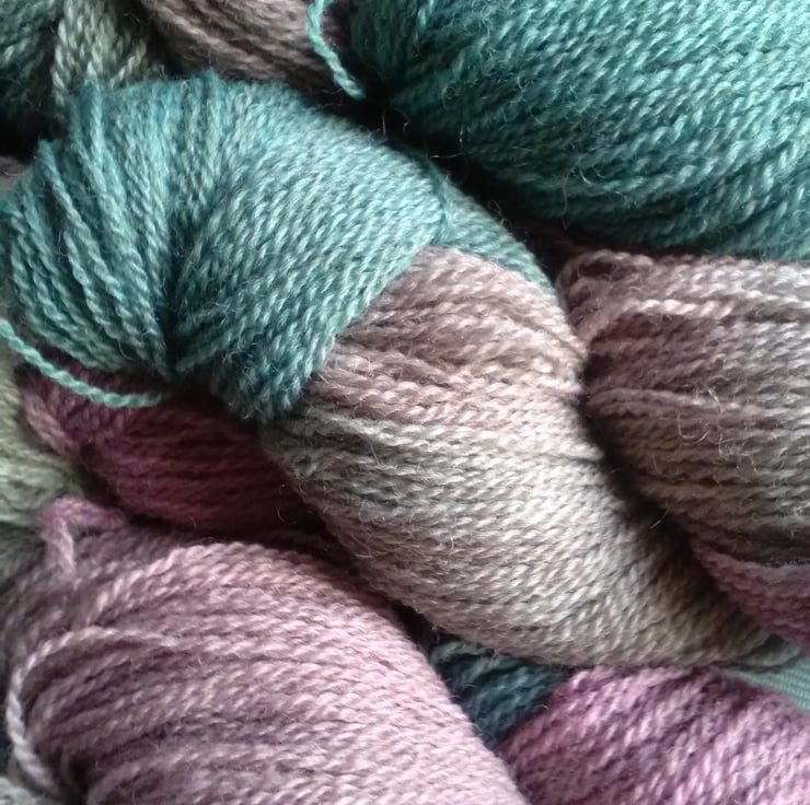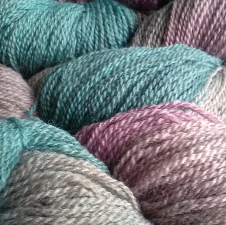 This hand dyed Falklands Corridale is a gentle mix of light Teal and Lavenders over a mixed grey base.