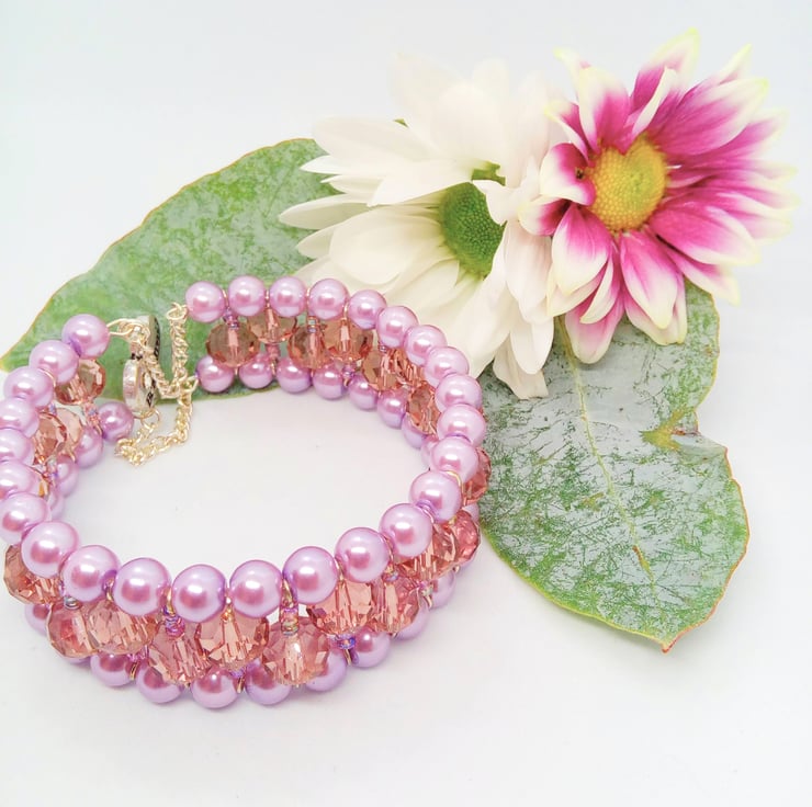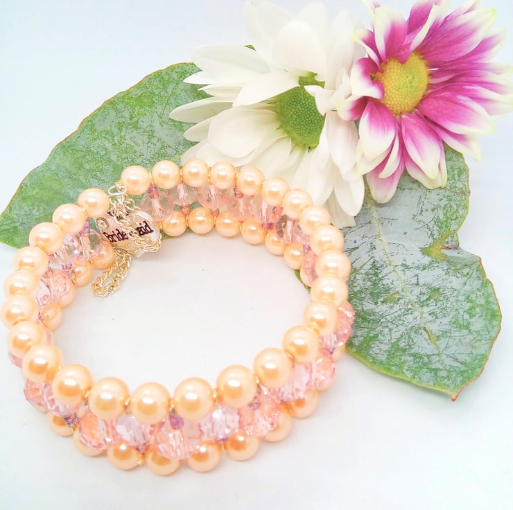 Stunning 2 strand memory wire beaded cuff bracelet made with glass pearl beads, crystal rondelles and seed beads. The bracelet will fit an average size wrist and has a safety chain to prevent it falling off. The bracelet would complement any outfit worn for your special day, or it would make an ideal gift for a bridesmaid or any of the special people who will attend your wedding. It would also make and ideal gift for your friends at your Hen Party.