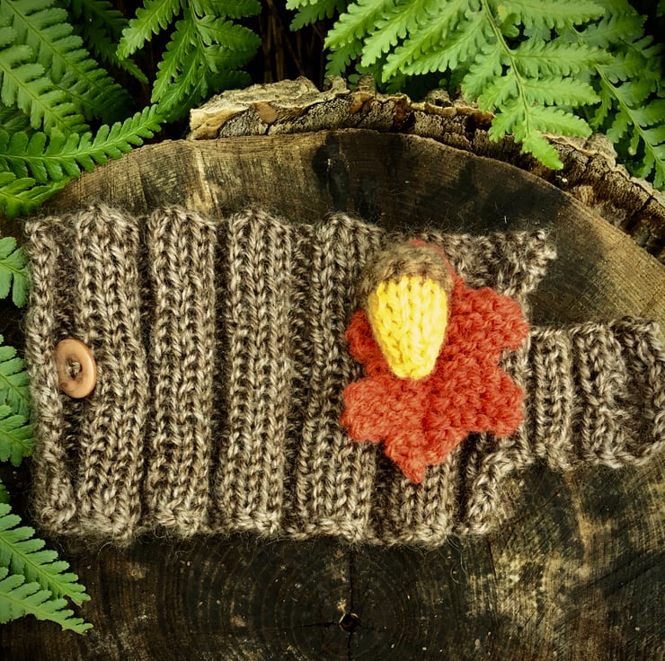 This rustic mug cosy is made with lovely brown aran yarn and has a knitted acorn and oak leaf attached in shades of russet, gold and brown. There is a buttonhole and brown button for fastening around the mug. Made with wool/acrylic mix yarn which will keep the mug nice and warm. Will fit a standard mug and measures approx 8cm in height.