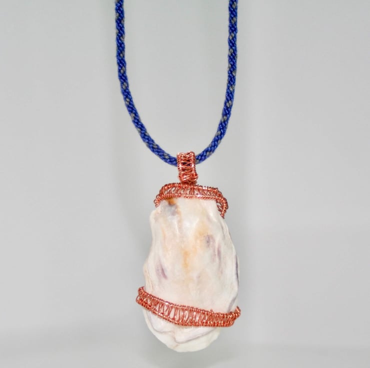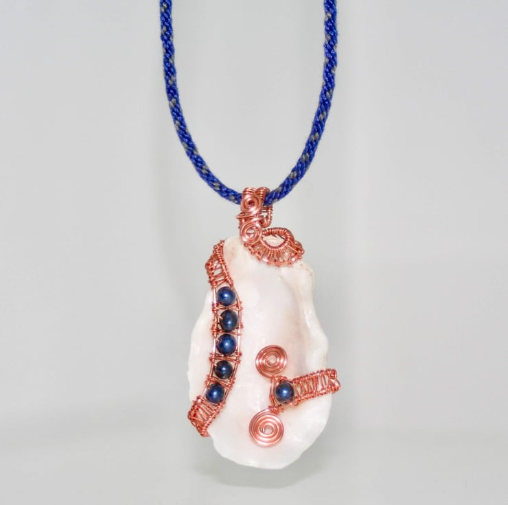 A natural oyster shell has been wire-wrapped with bare copper wire and cultured blue pearls interwoven into the structure.