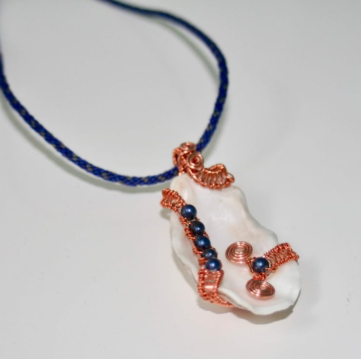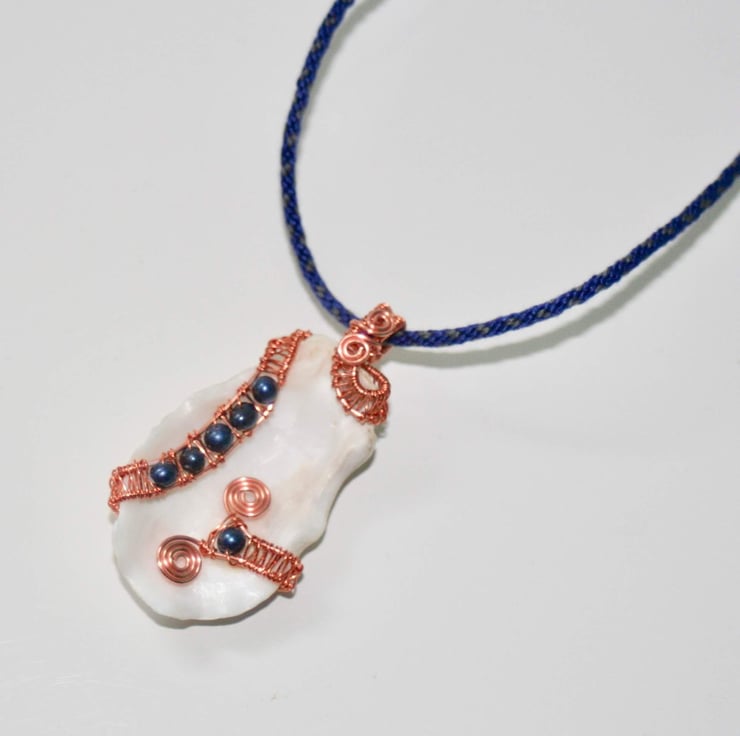 The oyster shell I found in Southend-on-Sea has a gorgeous natural pearlescent quality that is contrasted with the bright colour of the natural copper wire. The blue pearls are showcased beautifully within the woven wire.