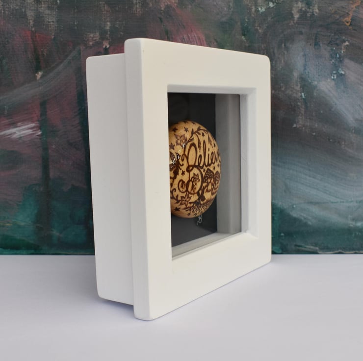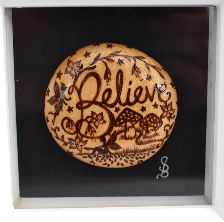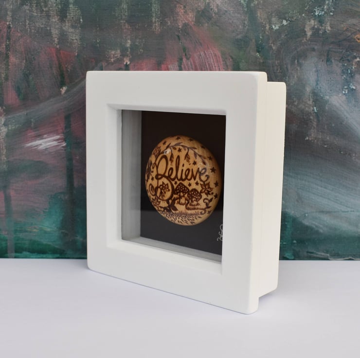 Here is a lovely unique mini box frame with a wooden pebble, carrying a woodland fairy themed design, with fairy silhouettes and a toadstool or two. The word ‘Believe’ in the centre. It would make a great gift for a parent, brother or sister, or maybe a good friend.