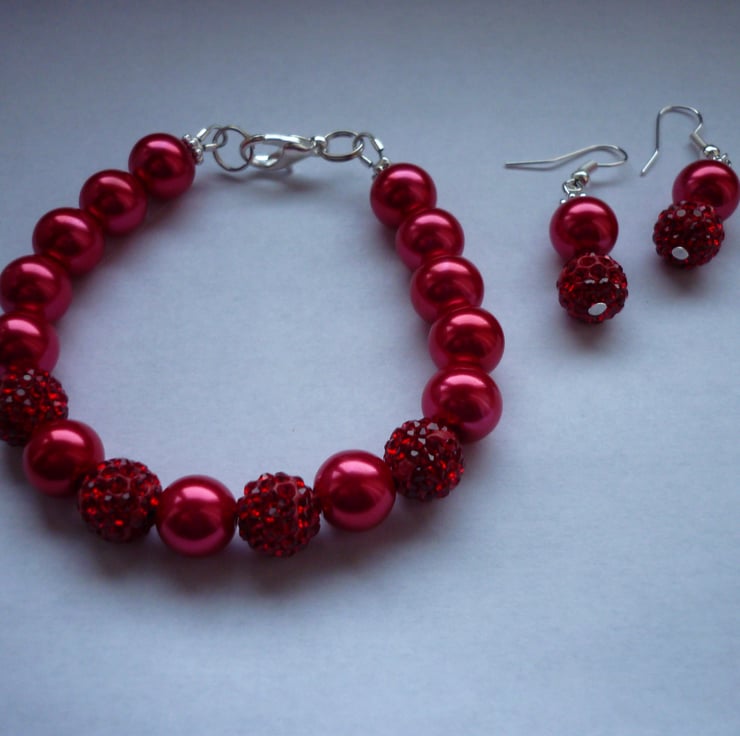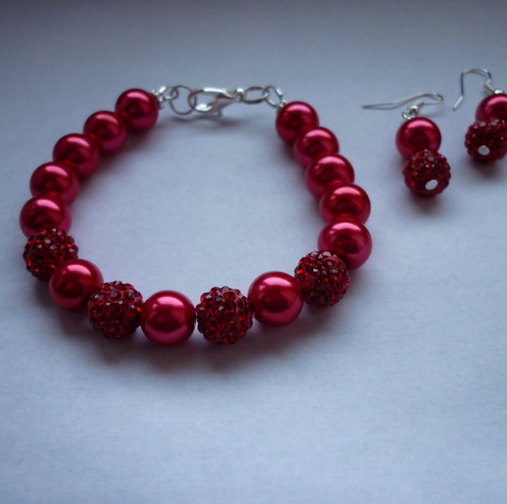 THE BRACELET AND EARRING SET HAVE BEEN MADE USING 10MM GLASS RED PEARL BEADS, 10MM RED RHINESTONE PAVE BEADS ALONG WITH SILVER PLATED FLOWER BEAD CAPS. THE BRACELET HAS BEEN FINISHED WITH SILVER PLATED LOBSTER CLASP AND THE EARRINGS FINISHED WITH SILVER PLATED KNICKLE FREE FISH HOOK EAR WIRES.