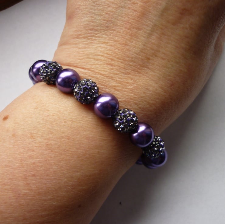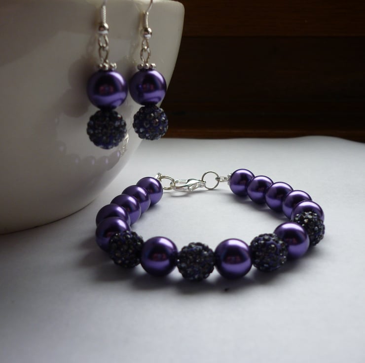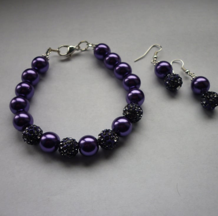 THE BRACELET AND EARRING SET HAVE BEEN MADE USING 10MM GLASS PURPLE PEARL BEADS, 10MM PURPLE RHINESTONE PAVE BEADS ALONG WITH SILVER PLATED FLOWER BEAD CAPS. THE BRACELET HAS BEEN FINISHED WITH SILVER PLATED LOBSTER CLASP AND THE EARRINGS FINISHED WITH SILVER PLATED KNICKLE FREE FISH HOOK EAR WIRES.