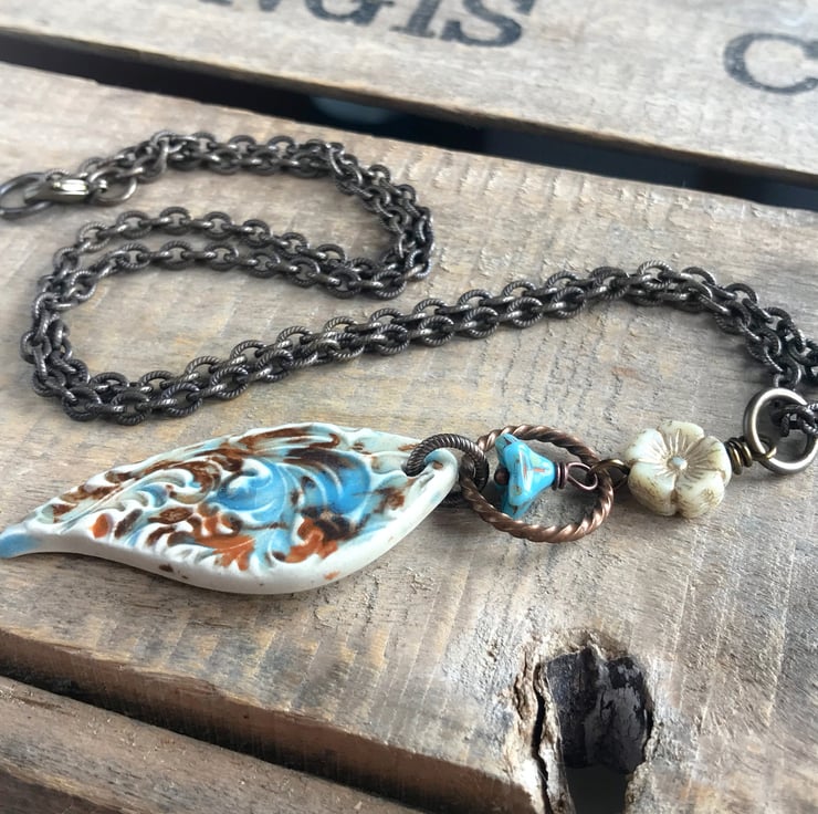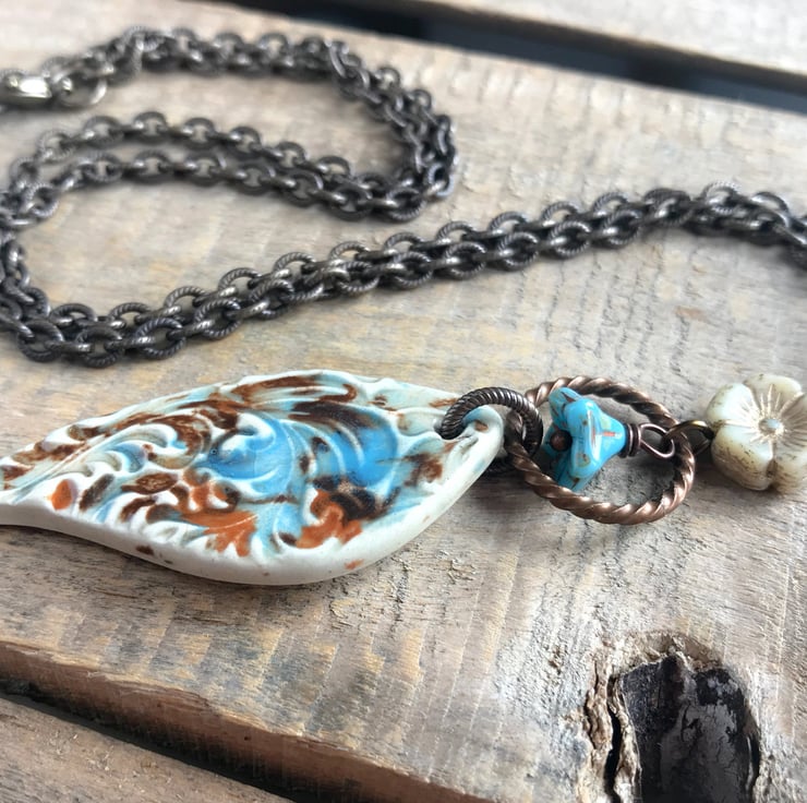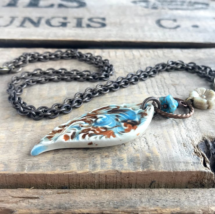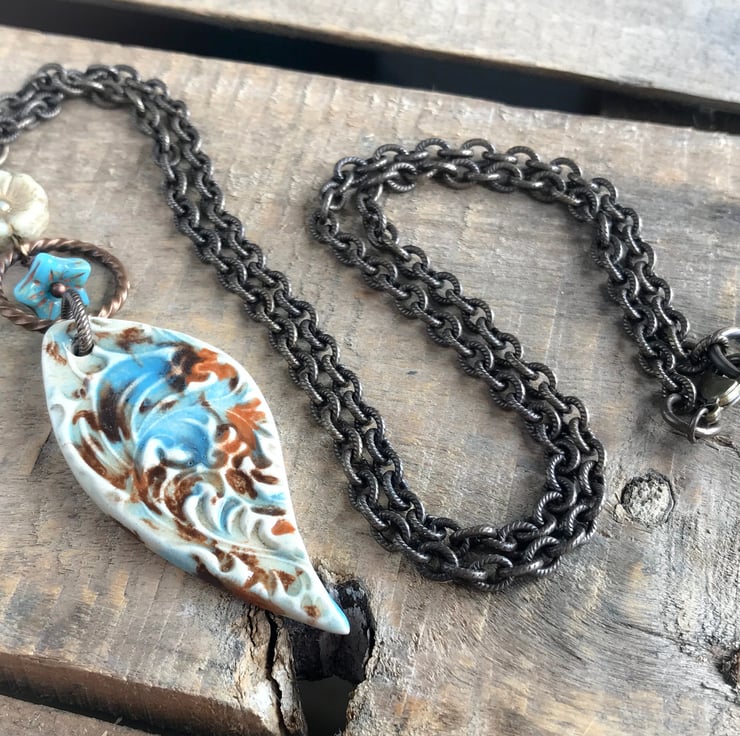 This unique necklace showcases a handcrafted ceramic pendant by bead artist Bo Hulley. The textured pendant is beautifully glazed in earthy tones of cream, brown, and blue.