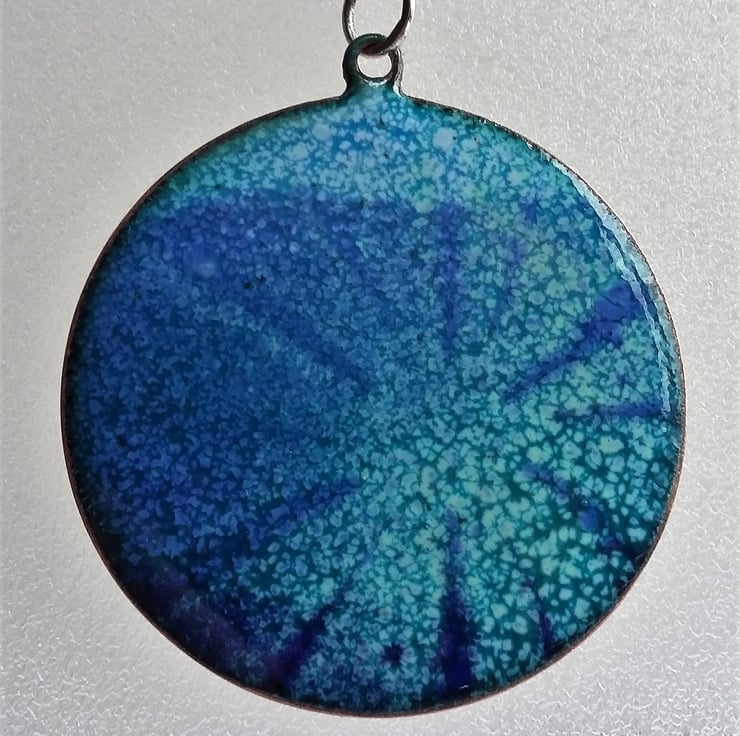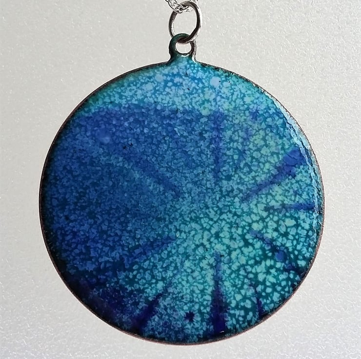 A pale green ‘firework’ bursts across a sky of lapis and light blue to give this pendant plenty of life and colour. The graduated top layer of turquoise and genoa blue transparent enamels have mottled the base coats to add extra movement and interest. A beautiful, bold statement piece.