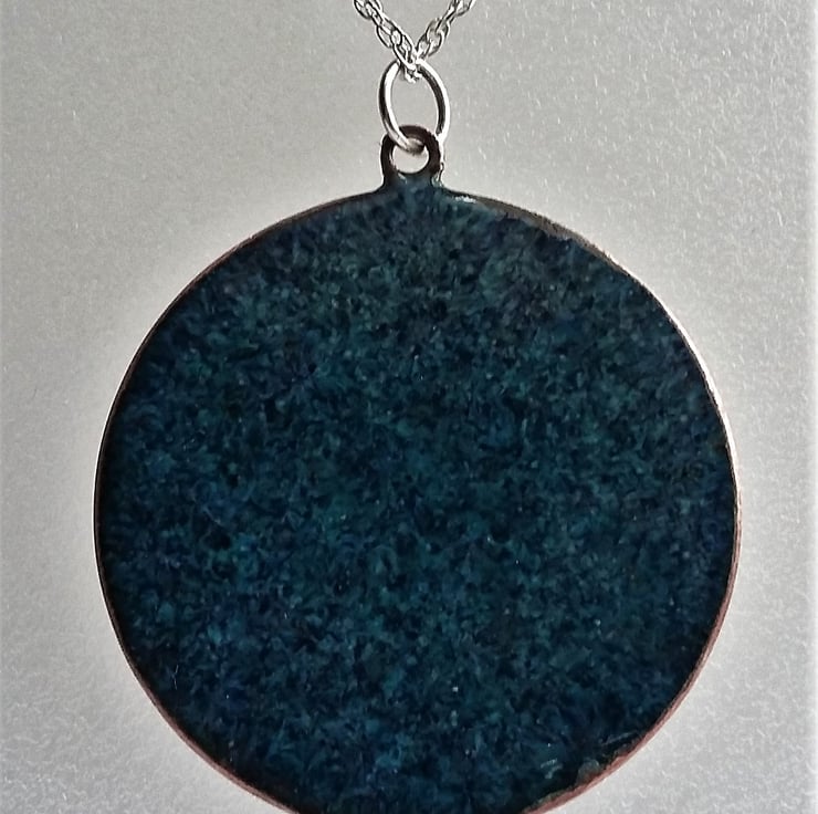 Large round enamelled copper pendant in shades of blue and pale green. The pendant has been kiln-fired and measures approximately 40mm in diameter. The back has been enamelled to give a lovely dark blue tweed effect. It comes complete with an 18” sterling silver rope chain with a soldered sterling silver jump ring attached to the lug and is supplied with a little organza pouch. POSTAGE IS FREE!