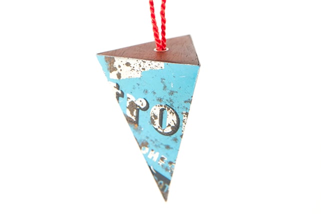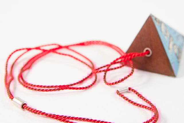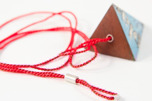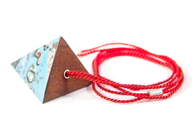 Made from an old Elastoplast tin. A 4 sided pyramid tetrahedron. It hangs beautifully from a red silk cord.