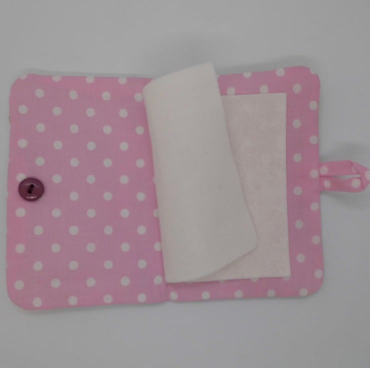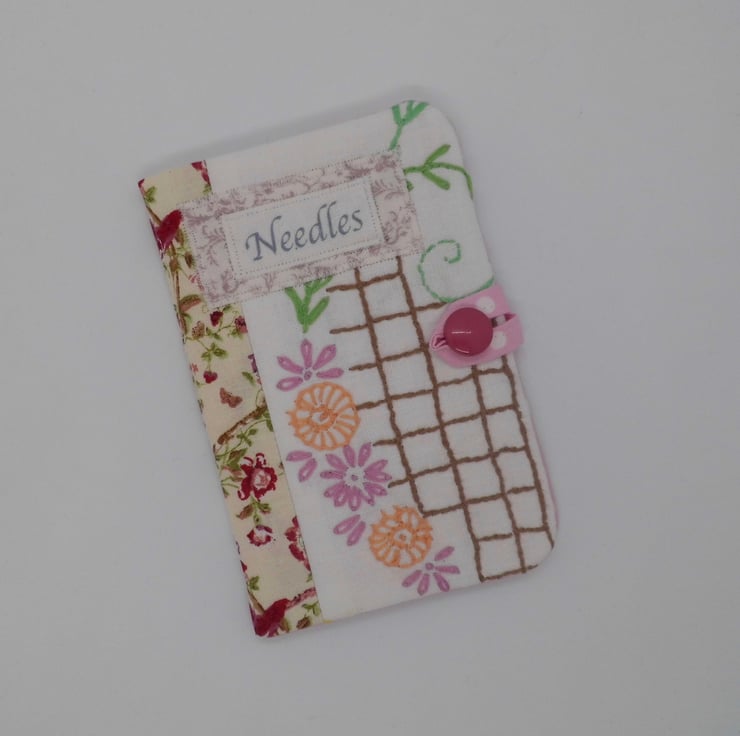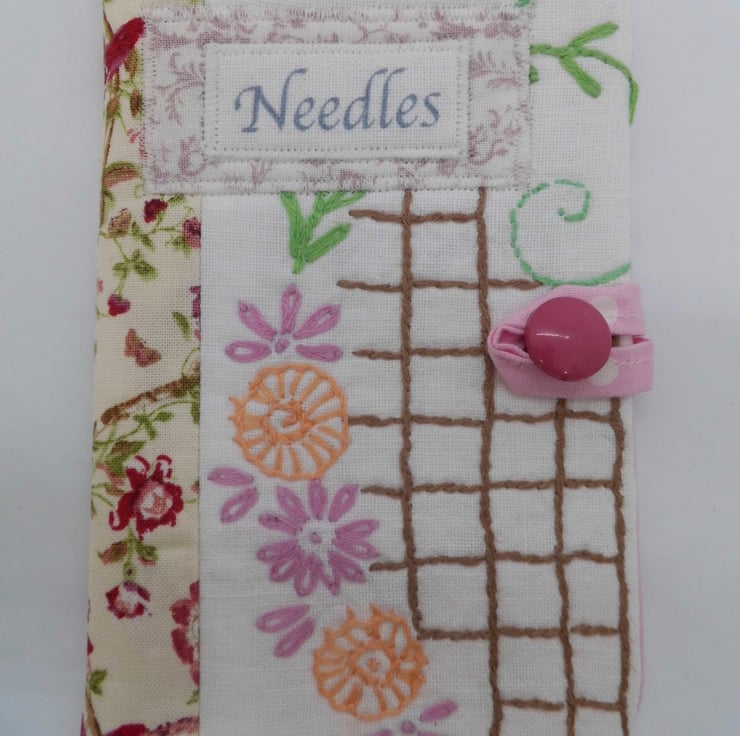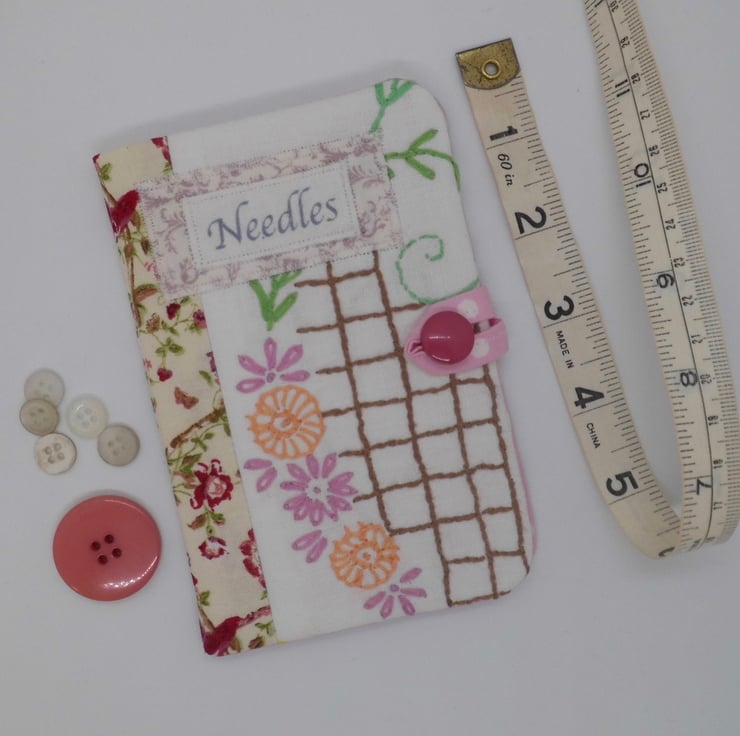 I have printed the word "Needles" onto cotton fabric and appliquéd this to the front on a patch of pale pink fabric. Inside are two leaves of white felt to hold needles and there is a button and loop fastening. Gently padded with fusible fleece. Measures approx 9cm x 13cm when closed.