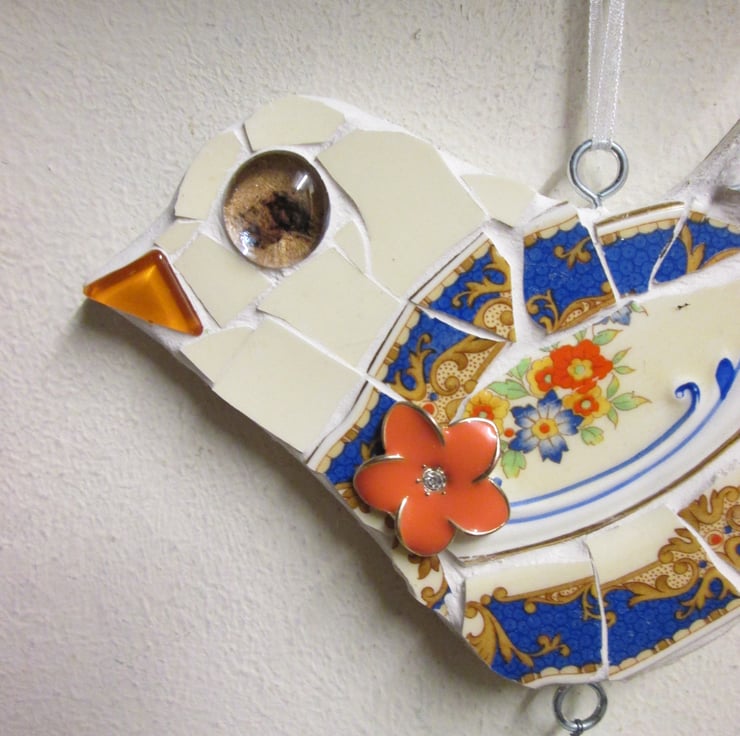 This mosaic bird has a hanging ribbon and underneath three beads and a jewel. It is 16cm x 22cm in size